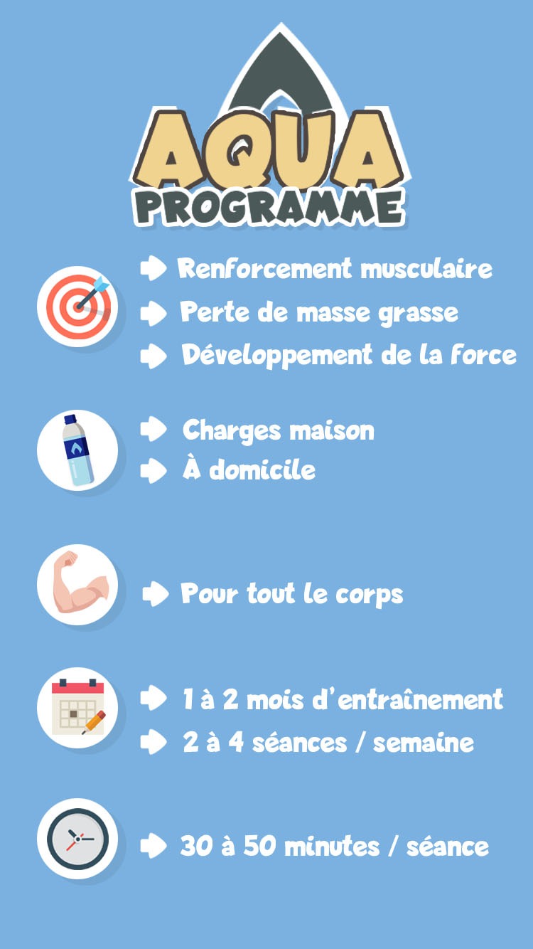 AQUA Programme est un programme adapté pour un objectif de renforcement musculaire, de perte de masse grasse et pour développer sa force.