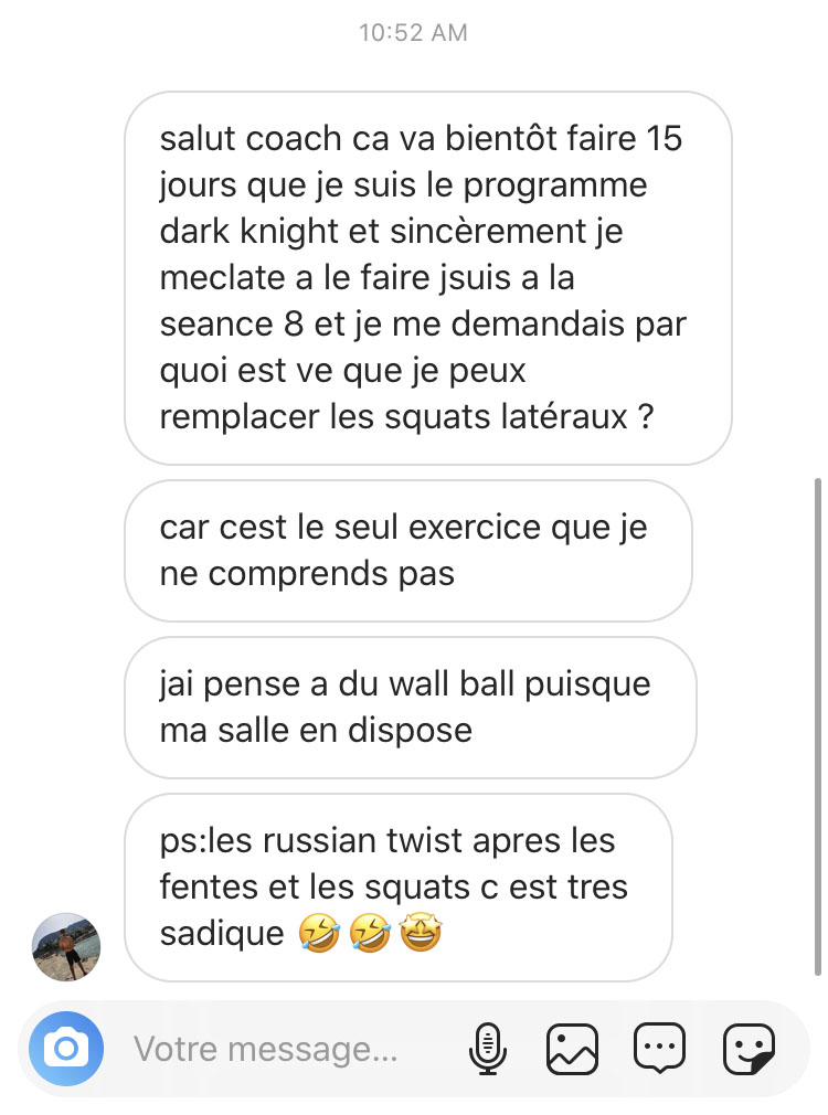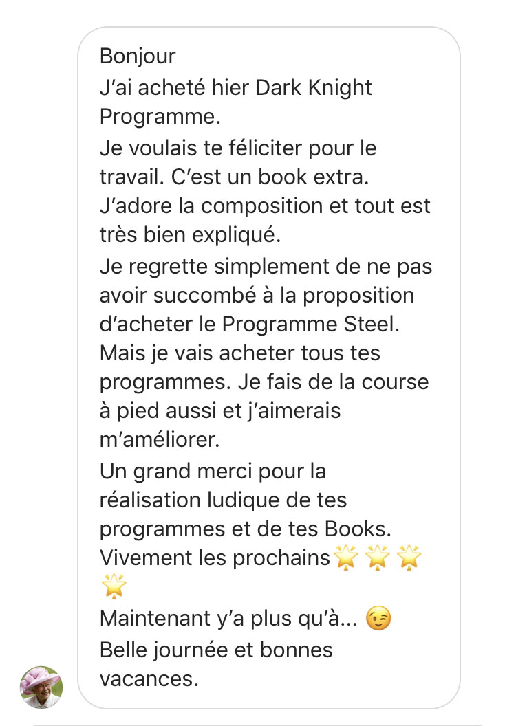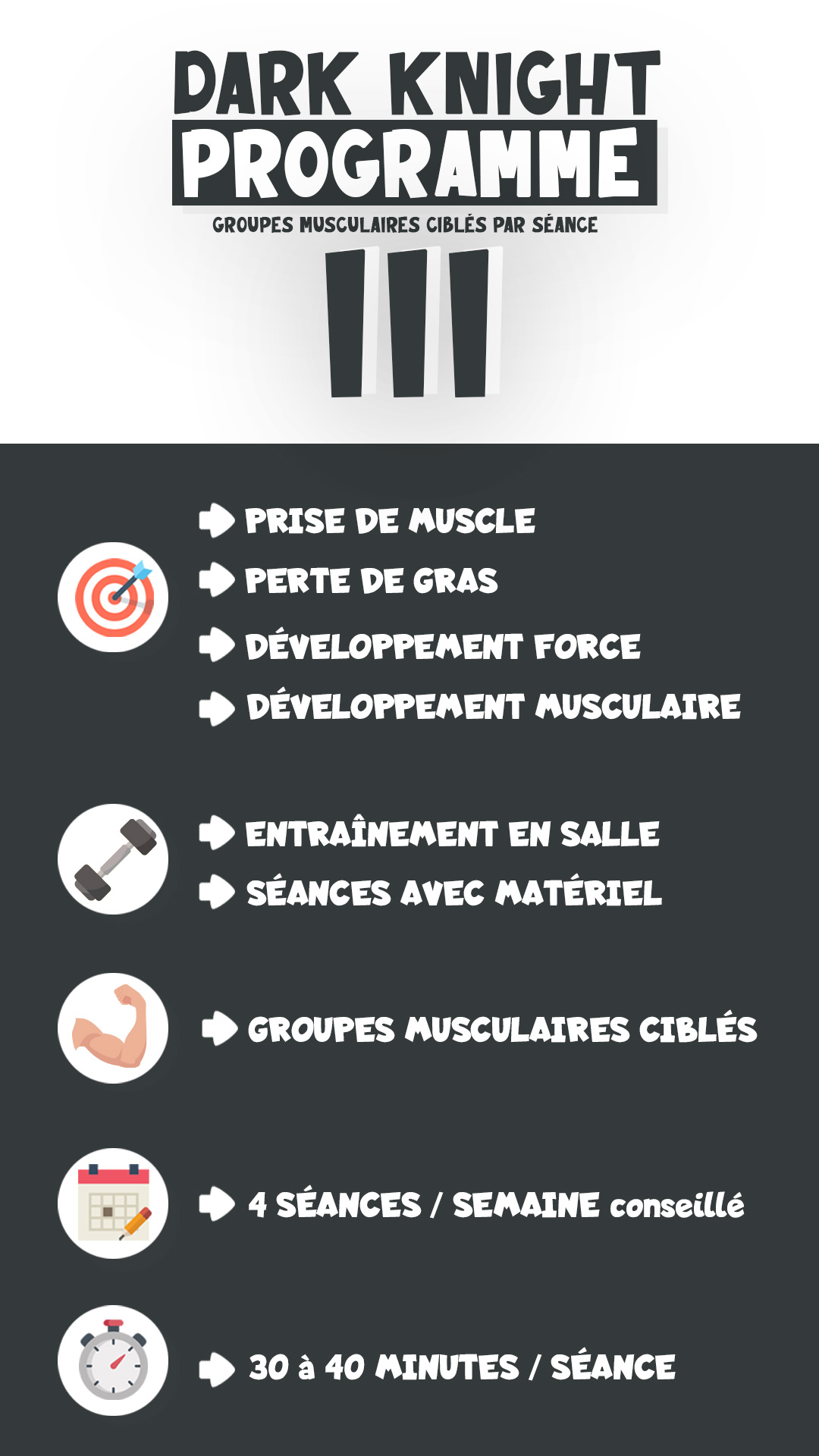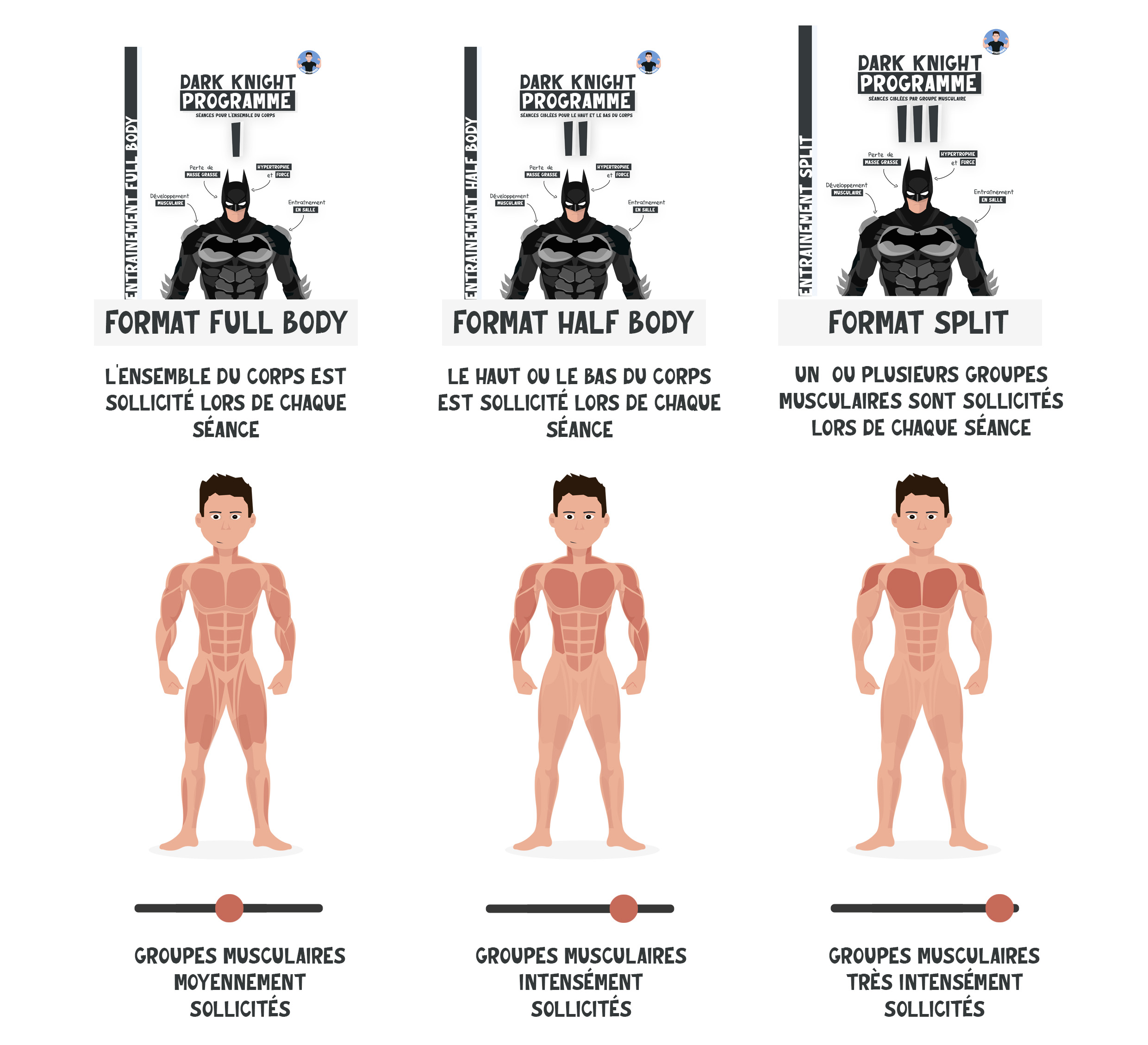 Dark Knight Programme I propose des séances qui sollicitent l’ensemble des groupes musculaires du corps (full body) : les groupes musculaires sont alors moyennement sollicités lors de chaque séance.