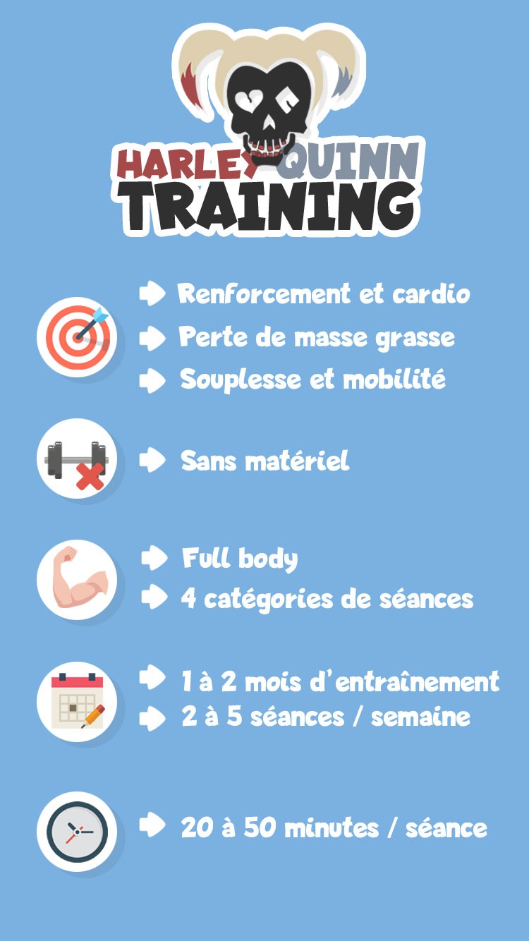 HARLEY QUINN Training est un programme adapté pour un objectif de renforcement musculaire, de perte de masse grasse et pour développer sa souplesse & mobilité articulaire