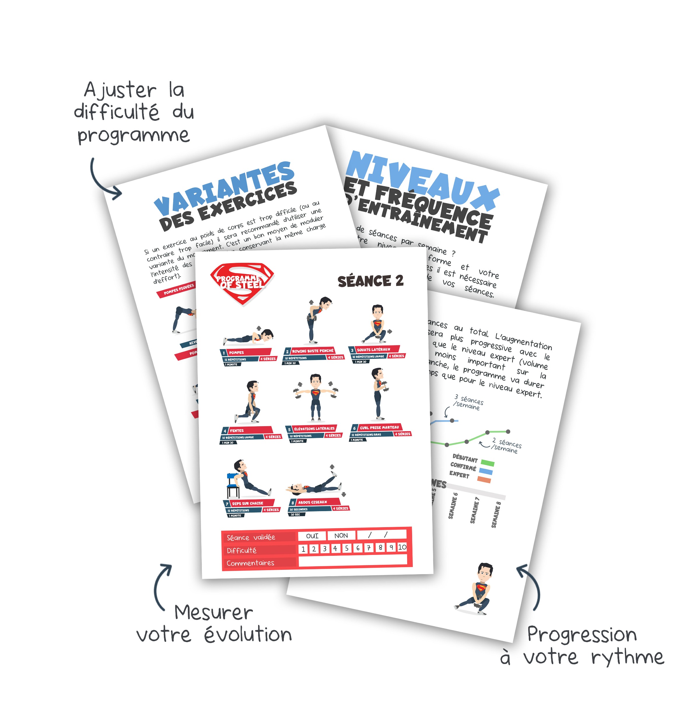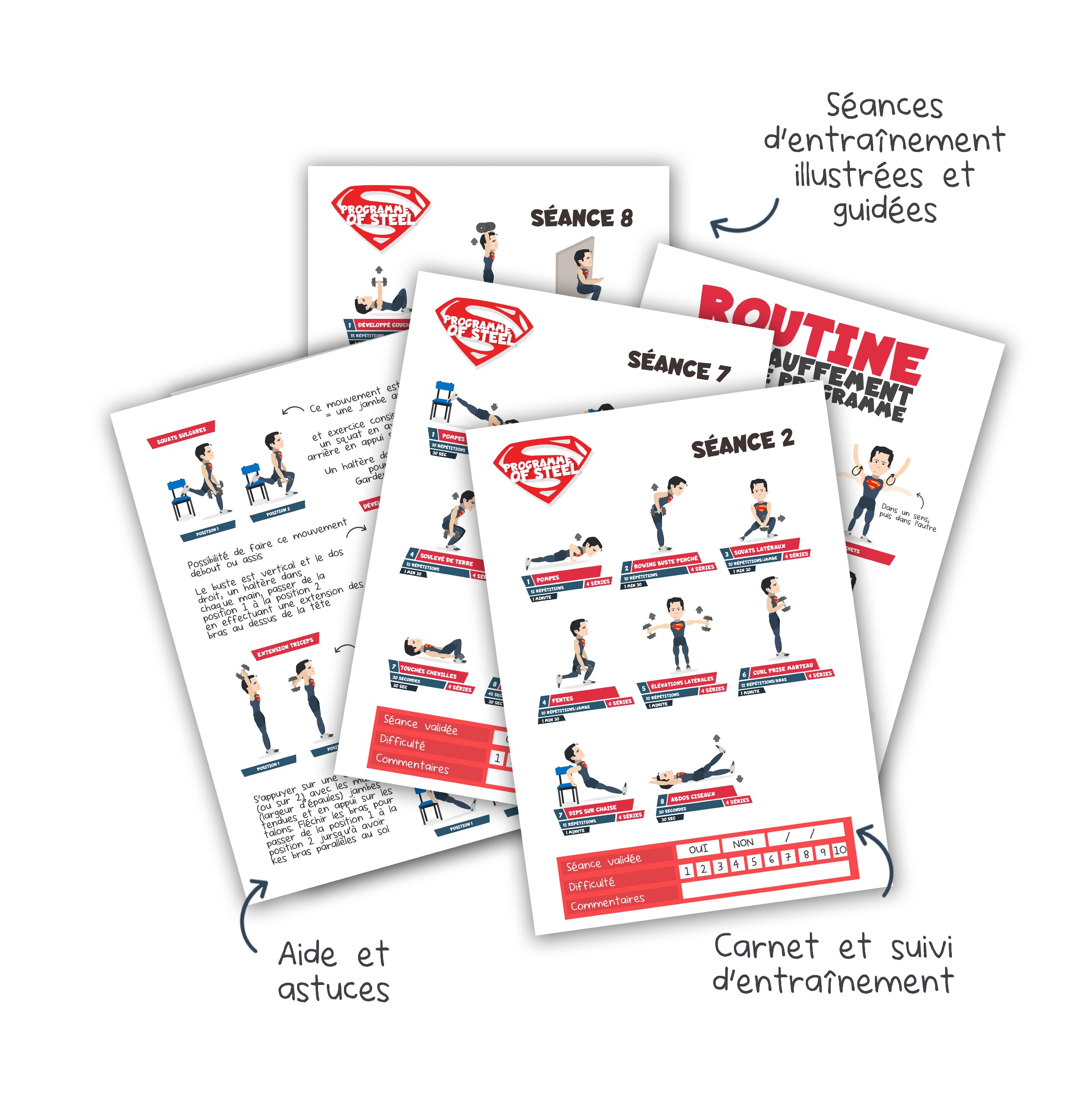 Les séances sont structurées pour tout le corps (full body). La spécificité du programme est de mêler des exercices au poids de corps avec des exercices nécessitant des haltères.